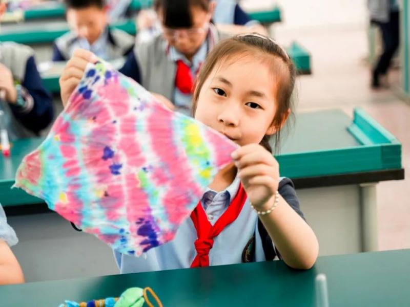 “扎”一束奇思,“染”一抹神奇。扎染是中国民间传统而独特的染色工艺,是中华民族优秀传统文化中绚烂的一笔。为了让同学们感受民间艺术的风采,低年级同学体验了一场别具一格的扎染活动。老师先介绍了“扎染” 艺术的基本概念和扎染流程。扎染最大的惊喜,就是独一性和神秘性。来瞧瞧同学们是怎么做的吧!