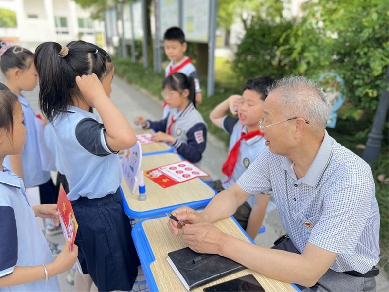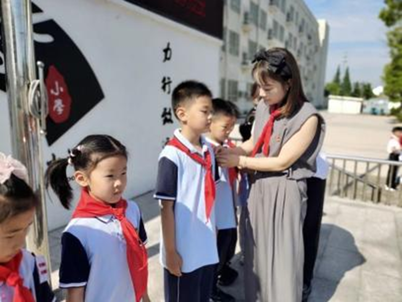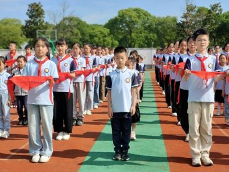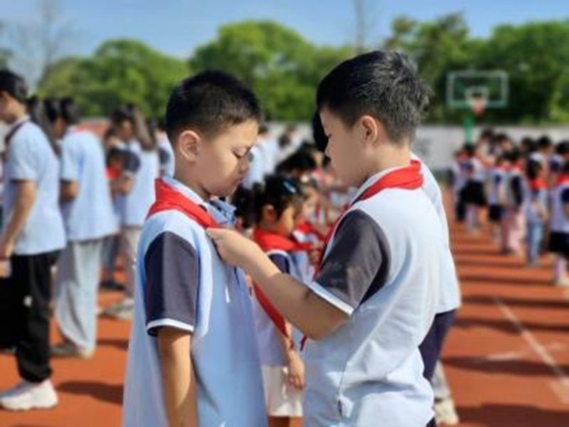 小小红领巾,代代永流传。队员代表为一年级新队员佩戴红领巾,并互敬队礼。鲜艳的领巾飘扬在新老队员队员胸前,理想的花朵绽放在所有队员心间。