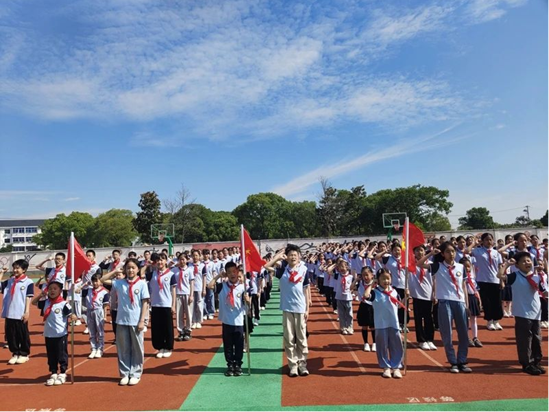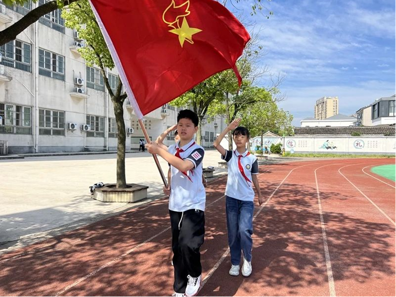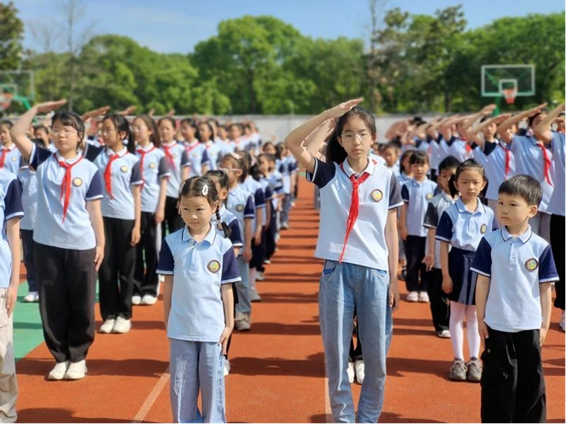 伴随着雄壮有力的《出旗曲》,旗手们迈着铿锵的步伐,高擎队旗,神情庄重地步入会场,他们昂扬向上的精气神感染着每一位预备队员。大家站得笔直,用坚定的目光迎接这光荣的时刻。随着熟悉的旋律响起,预备队员们用稚嫩而又响亮的声音高唱《中国少年先锋队》队歌。