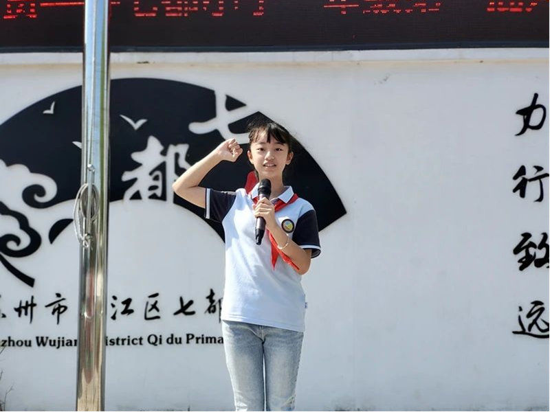 新队员代表发言,以掷地有声的话语表达了自己加入少先队后热爱祖国、好好学习的决心。