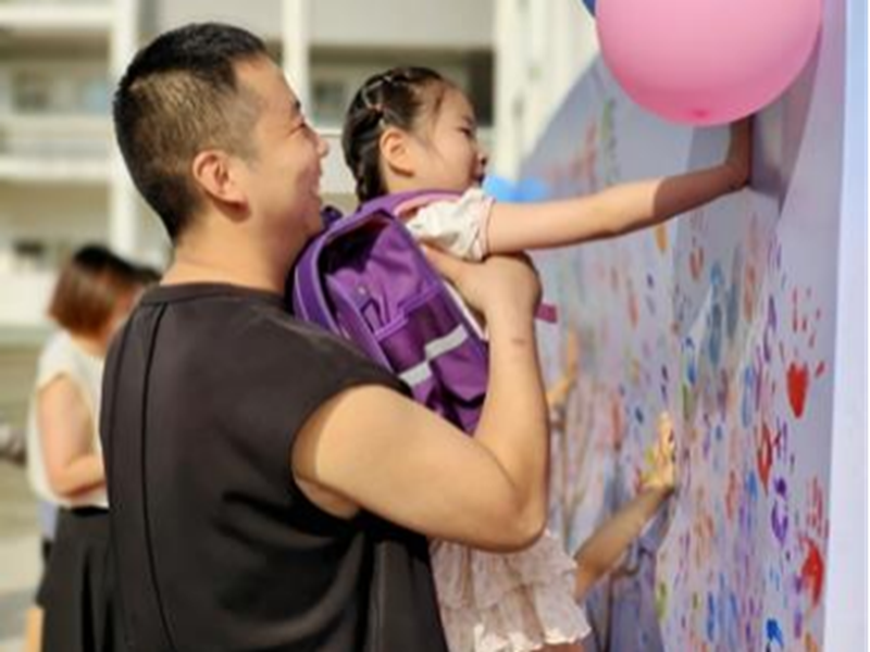 一年级的小朋友们双眸闪烁着喜悦和兴奋,拉着爸爸妈妈的手,伴着轻松明快的旋律,兴高采烈地走进新的校园。