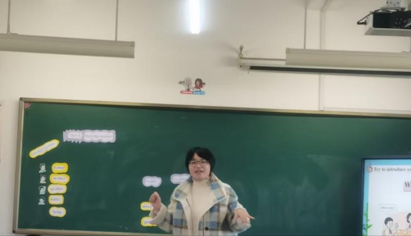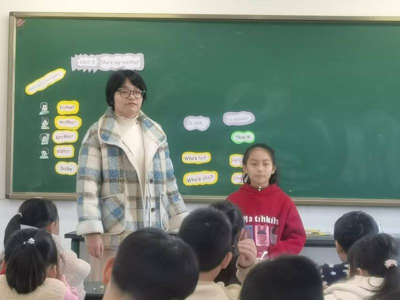 首先由冯丹老师执教3AUnit5 She’s my mother. 冯老师先通过展示家庭照片和播放相关视频引出单元主题“she's my mother”等家庭成员词汇,激发学生兴趣。接着利用单词卡片、实物道具等详细讲解新单词,辅以简单例句帮助理解。随后设计角色扮演、小组对话活动,让学生运用所学句型“She's...”“He's...”互相介绍家庭成员,锻炼口语表达。
